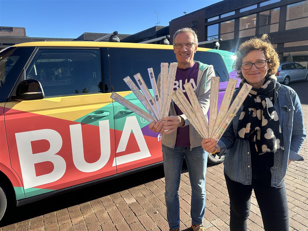 Roald Fjeldbo fra BUA/Frivilligsentralen har hjulpet prosjektleder Inger Marie Solberg med å få reflekser ut til skolene.