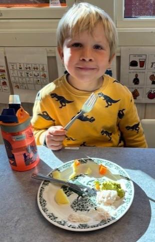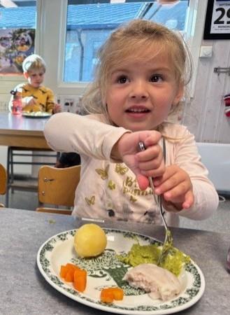– Alle får litt av alt på tallerkenen, men vi blander ikke maten. Det gjør det lettere for barna å spise det de liker. Noen spiser mest grønnsaker, andre poteter – og mange elsker fisken, sier hun. Hun fortsetter å fortelle at vi ser også at når et barn spiser og sier det er godt, så er det lettere for en som sitter ved samme bord og er litt usikker å prøve. Er det noen som ikke vil smake prøver vi oss med å si, «dette har vi aldri hatt før, så det tror jeg du liker».