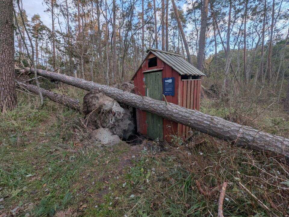 Trær og kvister ligger over stiene, og enkelte trær har falt eller lener seg mot andre trær. Disse kan fortsatt være ustabile og utgjøre en risiko for å falle. Trær som har veltet med deler av røttene i været, kan stå i spenn og også være svært uforutsigbare og farlige.