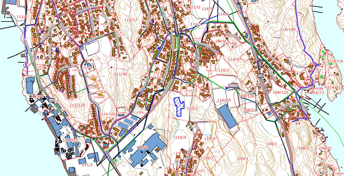 Kartet viser omrisset av skoletomta på Vesterøya.I landskapsplanen kan du se hvordan skolebygget og uteområdene skal bli. Lenken tar deg til PDF-en av landskapsplanen der det er enklere å zoome for å se detaljene i planen.