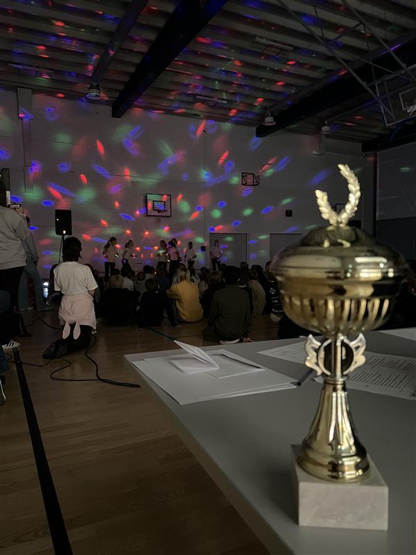 Etter at dommerpanelet hadde summert poengene, ble vinneren av Talentiaden 2026 kåret: Jentegruppa fra 7. trinn med turndans og glowsticks. De mottok både diplom og Talentiadens egen pokal – og ble møtt av stor jubel fra salen.