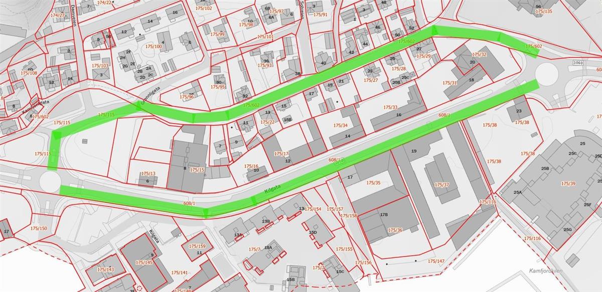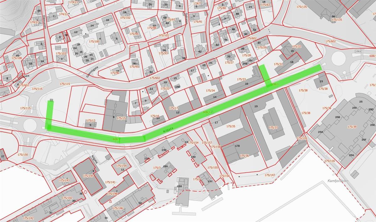 Kartutsnitt som viser omkjøring når Kilgata er delvis stengtFørstkommende mandag, 9. mars, utføres rørinspeksjon. I denne forbindelse vil Kamfjordgata være i bruk som omkjøringsvei i ca. 2-4 timer. Tilsvarende tidsrom gjelder for senere aktiviteter, som for eksempel når strømpekjøringen utføres.