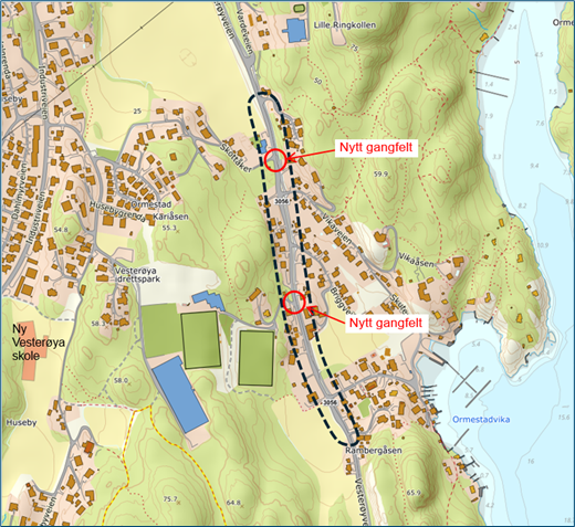 Vestfold fylkeskommune og Sandefjord kommune skal gjennomføre trafikksikkerhet- og kollektivtiltak på en omtrent 680 meter lang strekning langs Vesterøyveien ved Skottåker og Ormestadvika. Tiltakene som skal utføres er: