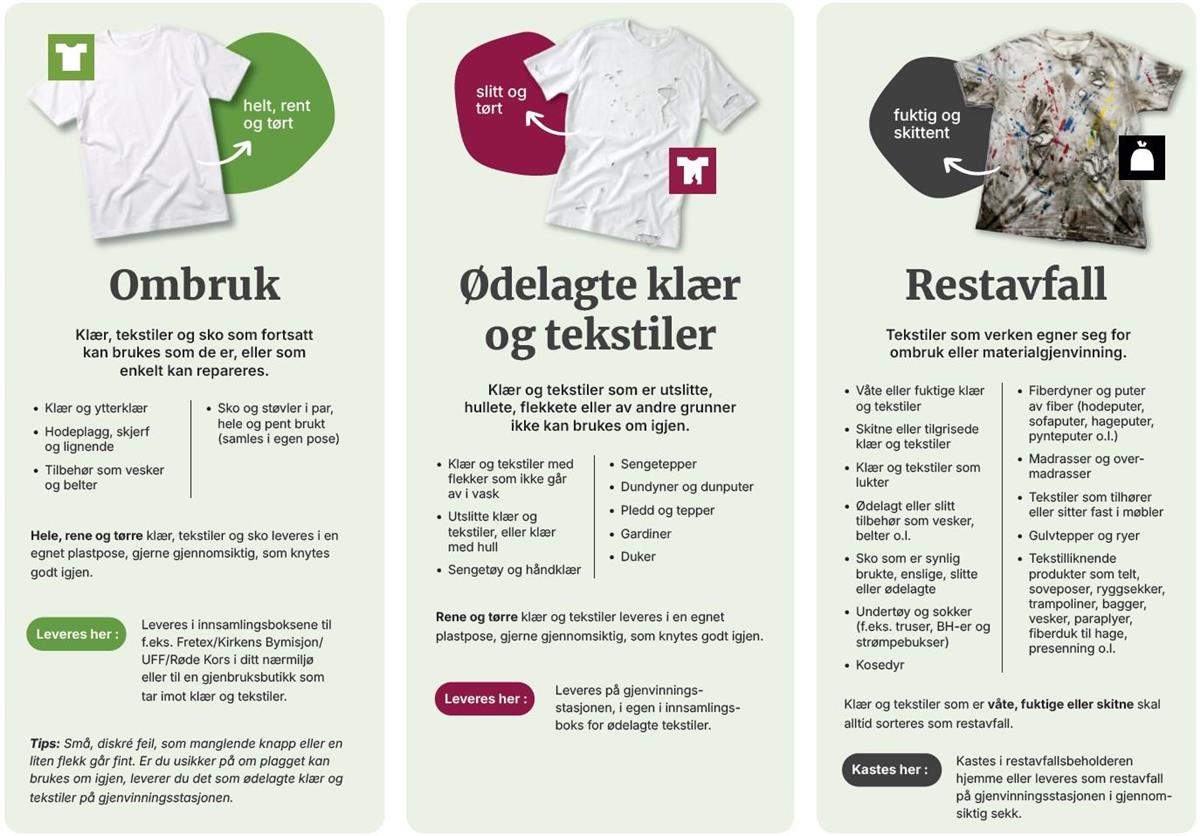 Ombruk: Klær og tekstiler som kan gjenbrukes skal levers til innsamlingsboksene til for eksempel Fretex, Kirkens Bymisjon, UFF og Røde Kors i ditt nærmiljø eller til en gjenbruksbutikk som tar imot klær og tekstiler. Se mer informasjon om ordningen på deres hjemmesider.