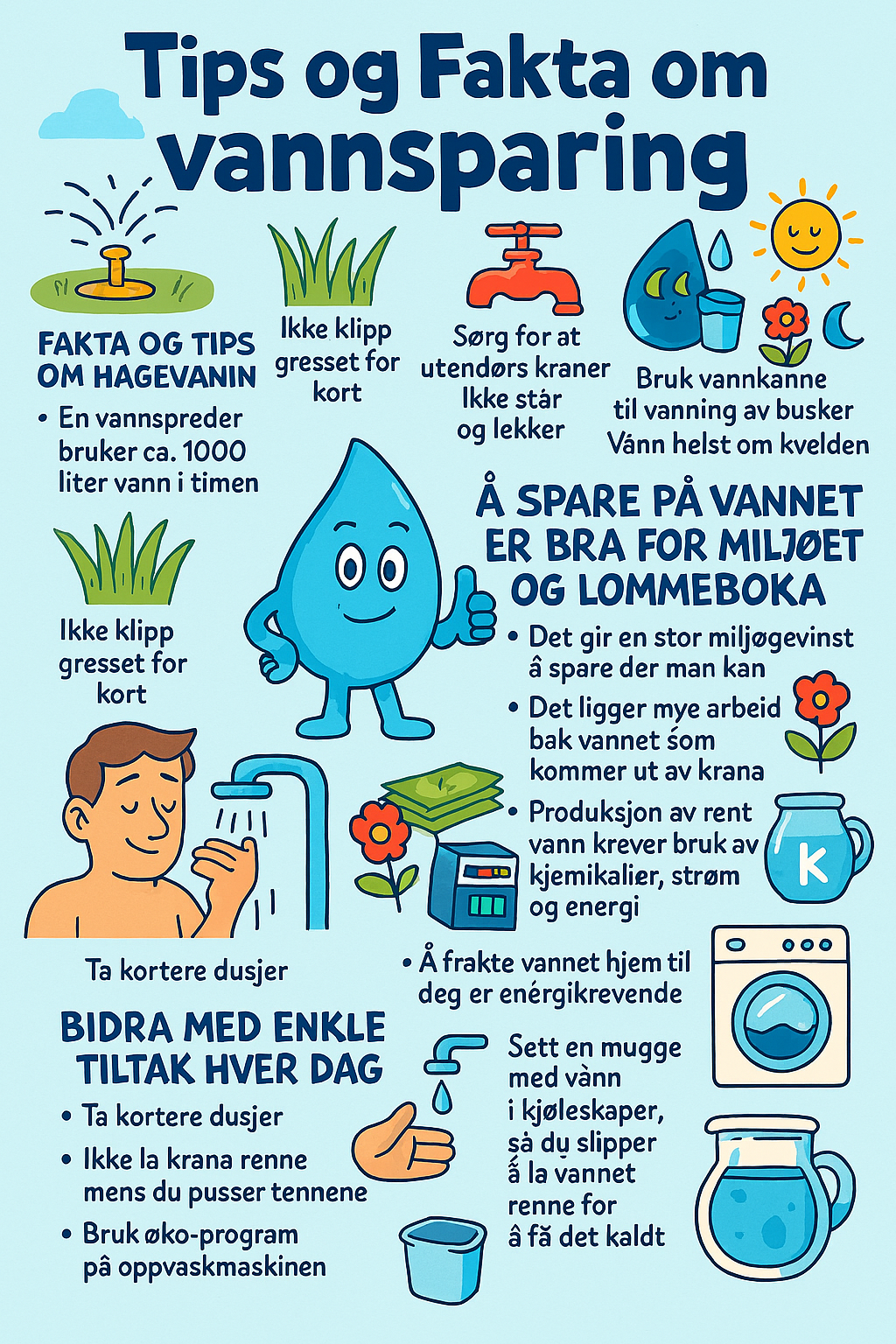 Vanning og vanningsrestriksjoner Vann er en sårbar ressurs. Det er kostbart å produsere drikkevann. Å spare på vannet er bra for både miljøet og lommeboka. Vanningsrestriksjoner i Sandefjord kommunePå varme dager kan vannforbruket både dobles og tredobles. Når mange bruker mye vann samtidig, kan vannverket få problemer med å produsere nok vann og noen vil kunne oppleve dårlig vanntrykk.Verken vannverket eller ledningsnettet er dimensjonert for et slikt høyt forbruk over tid, og i ytterste konsekvens risikerer vi at forbruket av vann overgår produksjonsevnen. Det kan også bli problemer med å levere vann til brannslukking.For å sikre at alle får vann gjennom sommeren, innfører Sandefjord kommune vanningsrestriksjoner etter behov. Normalt begynner vi med restriksjoner i midten av mai. Dersom du har privat vann, gjelder ikke restriksjonene for deg.Smarte vanningstips!Ikke klipp gresset for kort. Da klarer det seg bedre uten vanning.Bruk vannkanne til vanning av blomster og busker.Vann helst om kvelden, da fordamper mindre vann i solskinn.Led takvannet inn i busker eller blomsterbed.Samle regnvann i en tønne og bruk dette til å vanne blomstene.Vanning for deg som bor i gamle Sandefjord, Stokke, Kodal og LøkeVed vanningsrestriksjoner kan du vanne mellom kl. 18:00 – 23:00 på følgende dager, etter forbokstav i etternavn eller navn på borettslag/sameie:A–G: onsdag og lørdagH–L: mandag og torsdagM–Å: tirsdag og fredagVanning med kanne er lov alle dager. Dette er tillat på dine vanningsdagerVanning med vannkanneVanne bed, busker eller liknende med hageslange med munnstykkeVanne kjøkkenhage og drivhusVaske bil med høytrykk eller slange med munnstykkeVaske bolig med høytrykk eller slange med munnstykkeFylle vannbassenger mindre enn 1000 liter Dette er ikke tillatt - uavhengig av vanningsdager Vanning med sprederVanning med hageslange uten munnstykkeVanning av plenVanning av hekkVanning av store buskvekster og trærStandard abonnementsvilkår - 3.8 Kontroll og innskrenking av vannforbruk Abonnenten forplikter seg til ikke å sløse med vann. Under vannmangel eller når andre forhold krever det, kan kommunen innføre restriksjoner på vannforbruk til spesielle formål, for eksempel hagevanning. Kommunen kan i slike situasjoner også innføre andre restriksjoner. Eventuelle restriksjoner som kommunen finner det nødvendig å gjennomføre under vannmangel eller når andre forhold krever det, gir ikke rett til å kreve erstatning eller prisavslag.Søke om dispensasjon Det er mulig å søke om dispensasjon for følgende regler:Fylling av basseng eller liknende større enn 1000 literVanning av nysådd plenVanning av nylagt ferdigplen Vanning av nyplantet hekkSøknad om dispensasjon sendes til post@sandefjord.kommune.no. E-posten må inneholde: NavnAdresseTelefonnummerForespørsel om dispensasjonDispensasjon kan bli inndratt ved misbruk. Gode sparetips!Sjekk at utendørskraner ikke lekker, og at det ikke er trykk på vannslangen når den ikke er i bruk. Slanger under trykk kan utvide seg i varmen og lett hoppe av. Ikke la krana renne mens du pusser tennene.Bruk øko-program på oppvaskmaskinen.Spar klesvasken til vaskemaskinen blir helt full.Bruk den «lille knappen» på toalettet når du trekker ned.Sett en mugge med vann i kjøleskapet, så slipper du å la vannet renne for å få kaldt drikkevann.